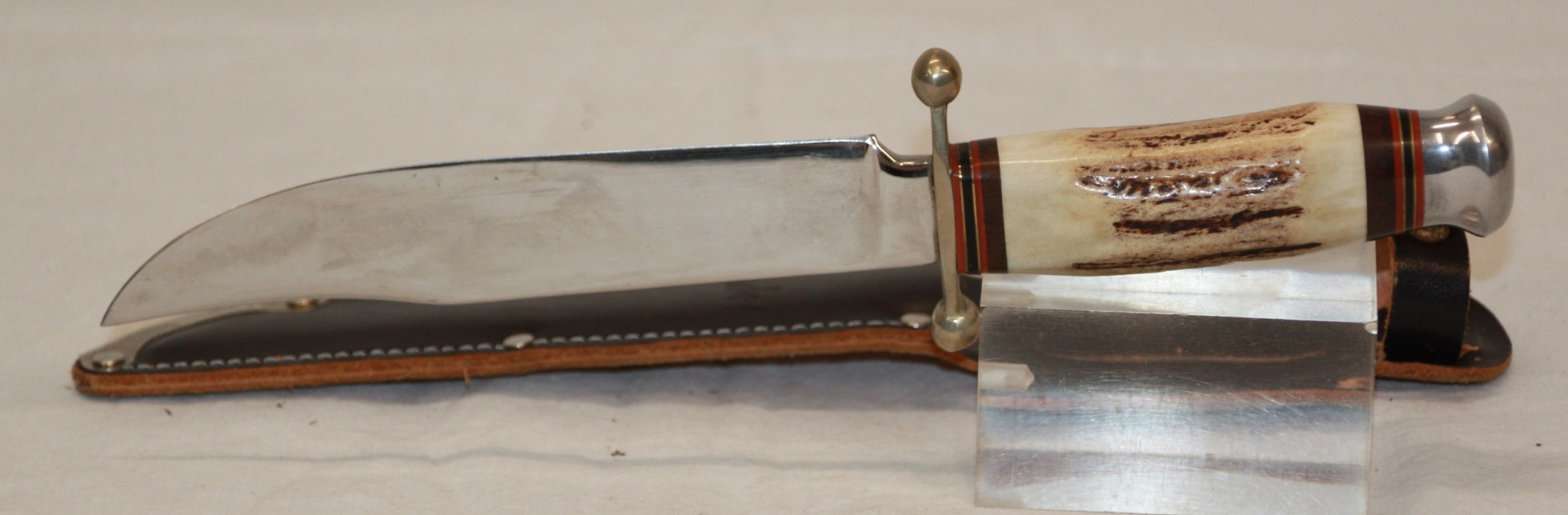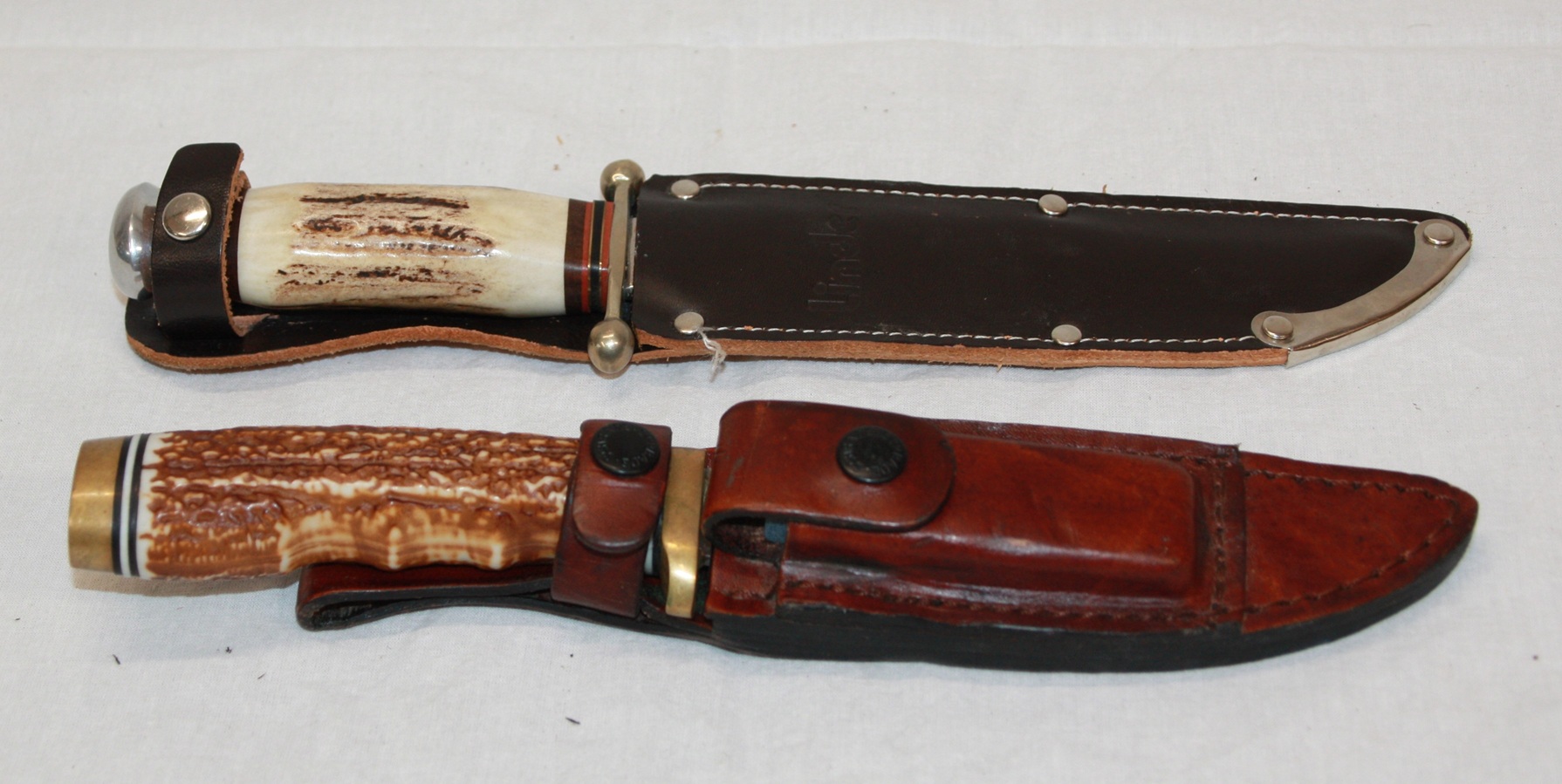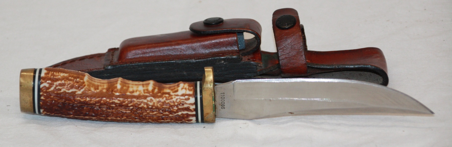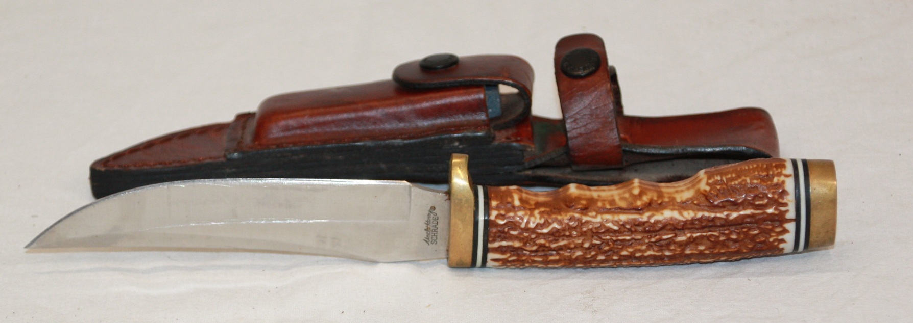 1 x Schrade "Uncle Henry" mit Lederscheide. Total 23,5 cm. Klinge 12,1 cm. Gewicht 172 Gramm.