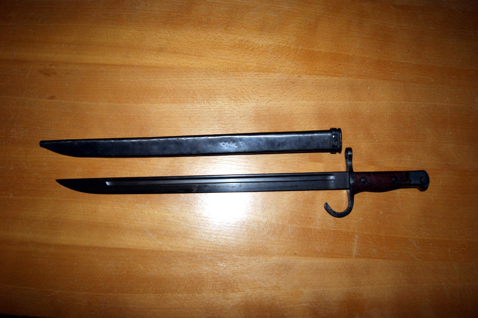 Zum Verkauf kommt ein mir Leider unbekanntes Bajonett in neuwertiger Erhaltung, die Gesamtlänge ohne Scheide ist ca. 50,5 cm, Klingenlänge ca. 40 cm.
