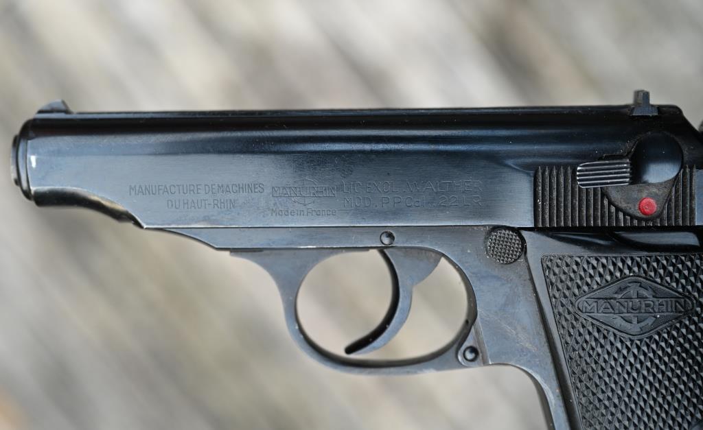 Kaliberangabe, Herstellerlogo, „Manurhin – Made in France“, „Lic. Excl. Walther“ (= Exklusivlizenz Walther), „Mod. PP“, Seriennummer, diverse französische Beschusszeichen „St. Etienne“.