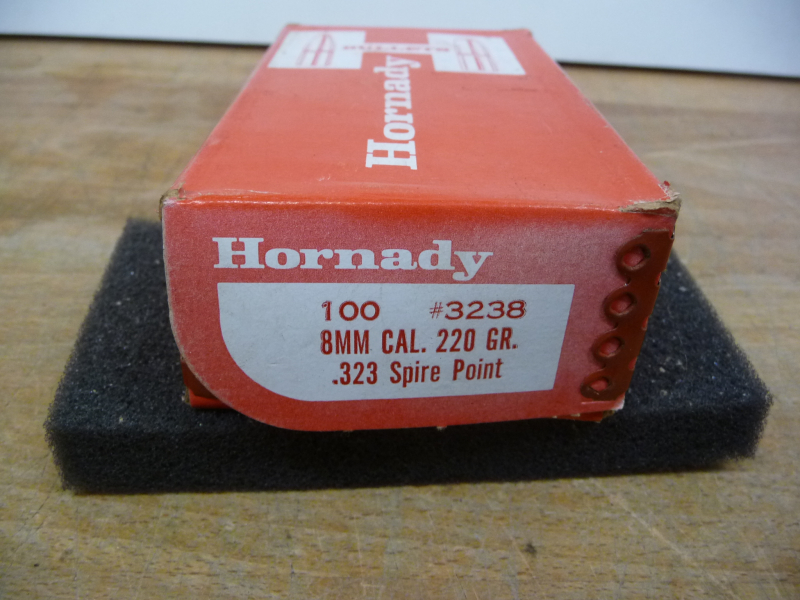 Hier wird z.B. eine geschlossene Packung mit 100 Stück Hornady Geschossen 8 mm / .323, 220 grain, TM-spitz angeboten.