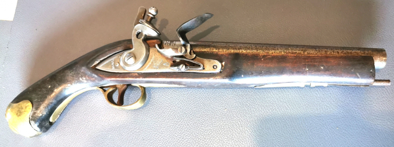 Sie bieten auf eine Steinschloss-Pistole Tower GR, Kavallerie England, um 1820 ohne Zündloch ,daher ohne Altersbeschränkung.
