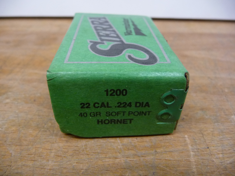 Hier wird z.B. eine geschlossene Packung mit 100 Stück Sierra Geschossen, .224, 40 grain, Hornet angeboten.