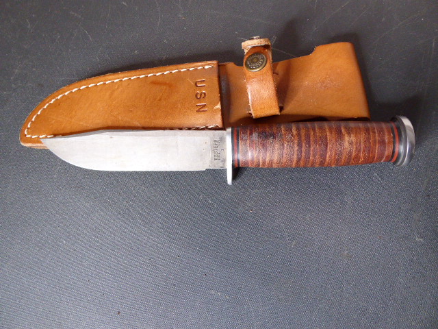 Aus meiner Sammlung gebe ich, ein altes Amerikanisches Bowie Messer Hersteller WESTERN USA ULA 71 mit Lederscheide ab. Griff aus Lederscheiben. Parierung und Knauf aus Eisen. Stabile einschneidige Klinge mit Hersteller WESTERN USA ULA 71. Scheide Leder mit Intrigierter Trageschlaufe, gestempelt USN. Kenner werden es sicherlich wissen wo das Teil getragen wurde. Das Teil ist im Guten Sammelwürdigen Zustand. Alles andere entnehmen Sie Bitte den Fotos. Gesamtlänge: 25,5 cm, ohne Scheide: 23,5 cm, Klingenlänge: 12,5 cm, Klingenbreite: 2,7 cm. Kann zu jederzeit bei mir besichtigt werden. Privatauktion keine Rücknahme und Garantie.