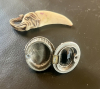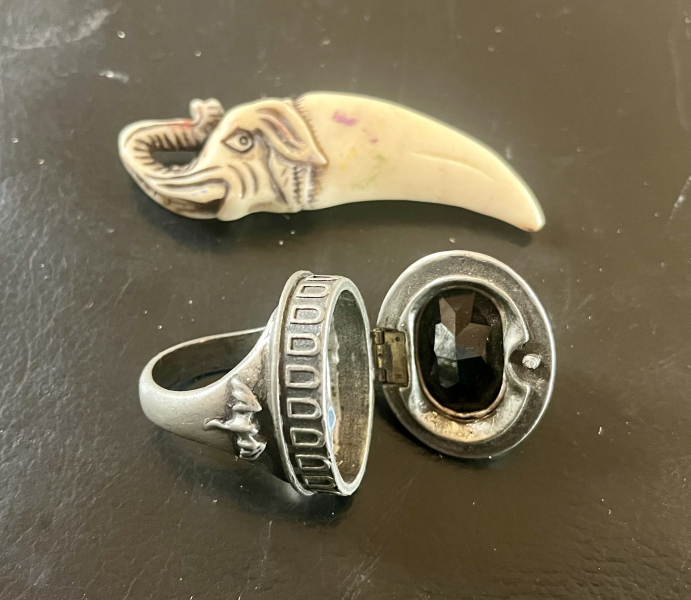 Schwerer, grosser Giftring mit rotem Stein, seitlich Fledenausornamente, Innenfach mit Klappdeckel, Reisszahn mit Elefantenschnitzerei als Umhängeamulett..