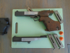 Sehr gepflegte Ganzstahl-Sportpistole. Herstelleler Sako, Modell Triace, Kaliber .32 S & W mit Wechselsystem Kaliber .22 lfb. Jeweils 2 Magazine dabei. Kleiner Schönheitsfehler am Wechselsystem: vorne links am Laufgehäuse, wie auf Foto zu erkennen ist, kleine Rostnarben. Die Waffe funktioniert einwandfrei und ist sehr präzise. Fragen beantworte ich gerne per email. Waffe ihat einen neuen Griff mit verstellbarer Handballenauflage der Fa. Rink.