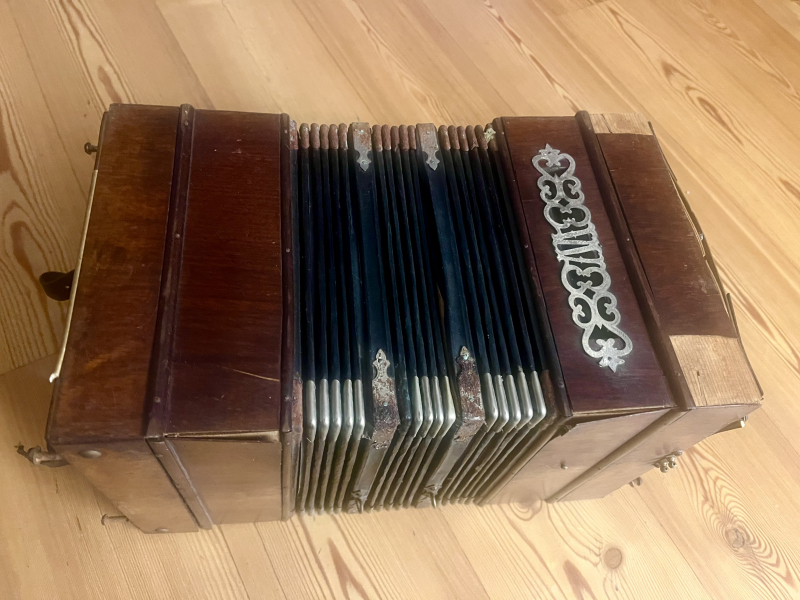 Antike Ziehharmonika Bandolion mit Koffer, kleinere Furnierstücke fehlen, sonst aber funktionsfähig...