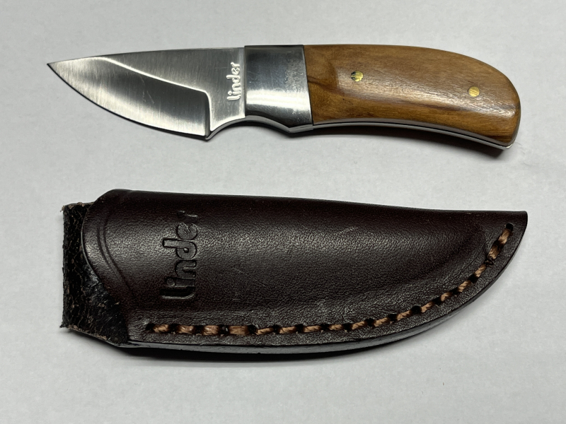 Klinge, rostfrei. Rostfreie Backen. Starke Lederscheide. Klingenlänge 5 cm.
