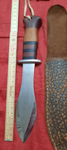 Ich biete hier ein originales, sehr scharfes Jagdmesser mit EXPERT-Ätzung aus Solingen und originalem Wimpel an. Klingenlänge: 15,5 cm, Klingenbreite: 4,5 cm, Klingenstärke: 3 mm, Gesamtlänge: 26 cm. Holzgriff. Umtausch und Rückgabe ausgeschlossen.