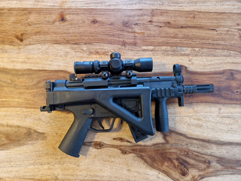 Optisch wie H&K MP-5 K, das seltenste Modell der Reihe, und damals Gegenstand einer weltweiten Klage von Heckler & Koch die zur Einstellung der Modelle geführt hatte.