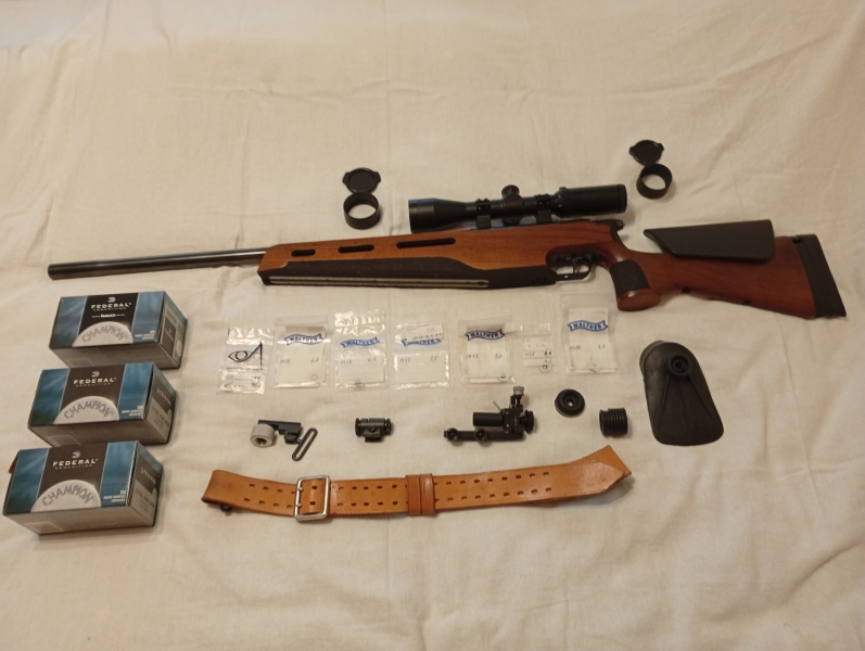 und 7x klare Körner von 3,8 bis 6.8mm. Einen Schießriemen, Riemenhandstopp und 1500 KK Patronen