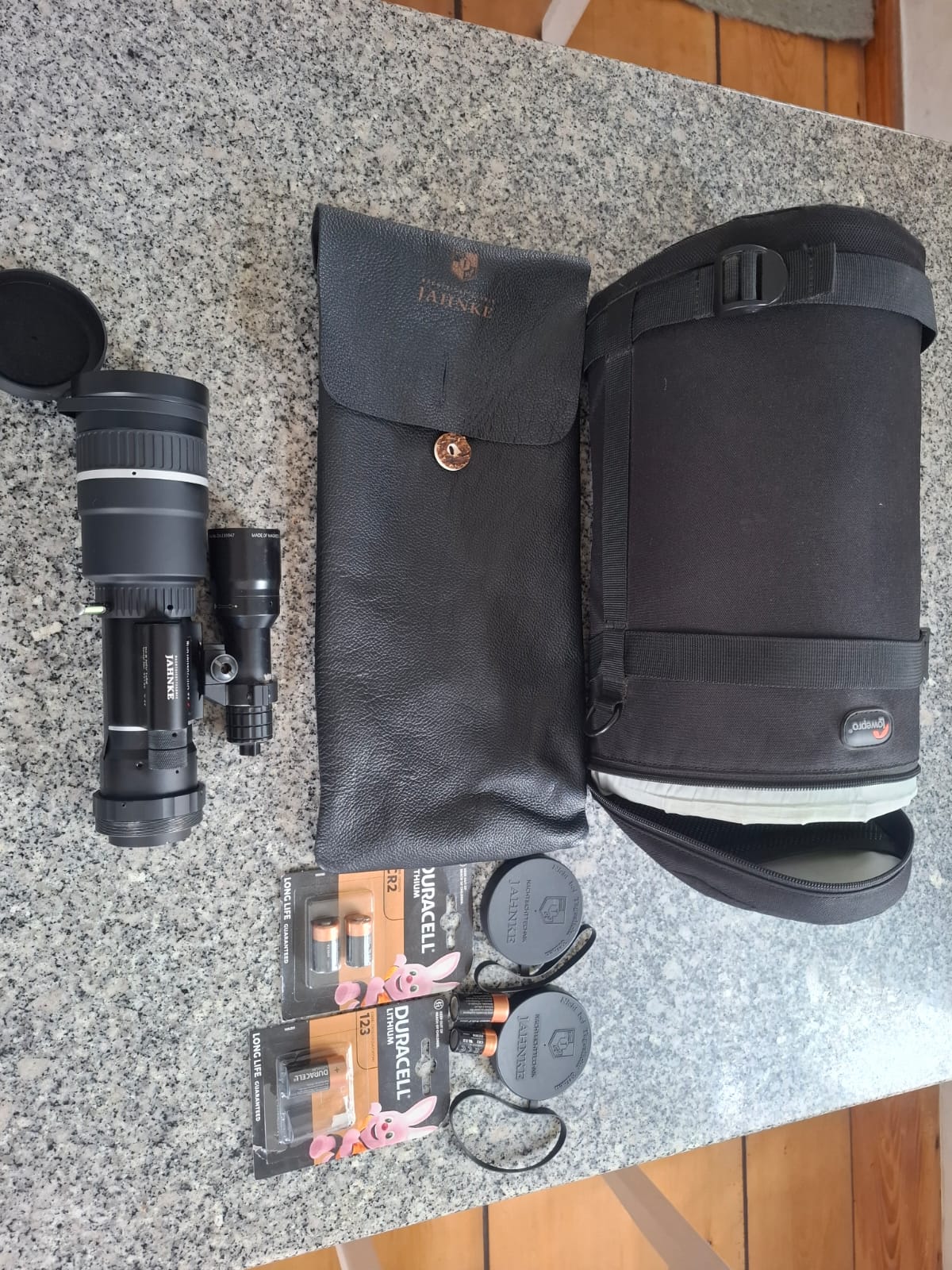Verkauft wird das Gerät wie abgebildet inklusive der Ersatz-Objektivdeckel, Batterien, Tragegurt, Jahnke-Tasche und der hochwertigen Tragetasche von Lowepro. Ich habe für das Gerät drei Rusan-Adapter ARM52 mit 48, 56 und 62 mm Durchmesser (passen z.B. auf Swarovski-Gläser mit 42er, 50er und 56er-Objektiv). Sollte einer davon beim Zielfernrohr des Käufers passen, gebe ich den dazu.