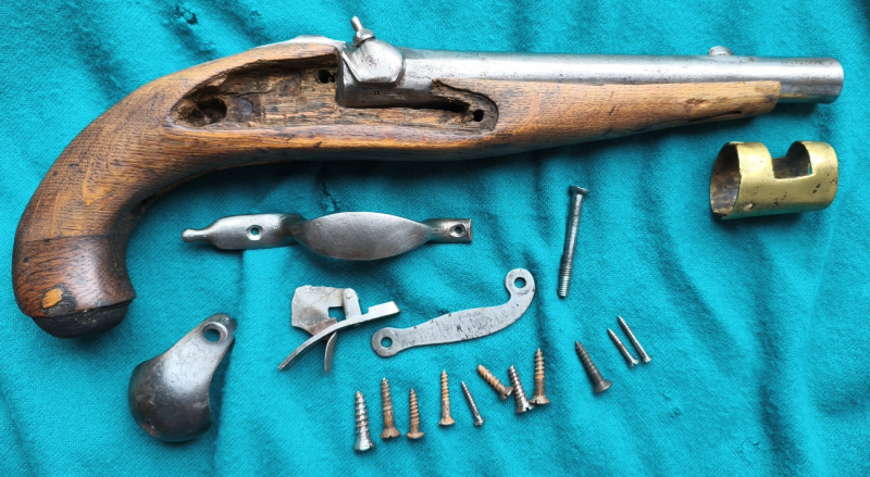 Gestempelter Lauf, feststehende Kimme. Originale Kolbenkappe, Schloßgegenplatte, Abzugsbügel (etwas gekürzt), Bodenplatte mit Abzug, dazugehörige Schrauben. Schaft (vielleicht später, sieht aber original aus). Gesamtlänge inkl. Lauf 37,5cm.