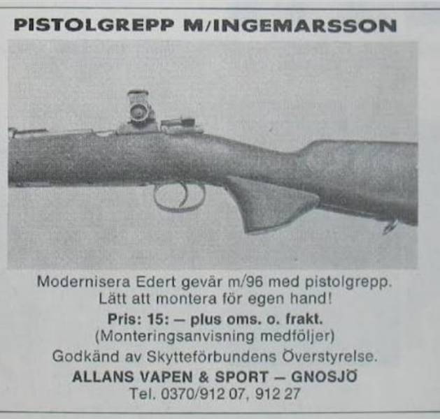 Es handelt sich hier um ein mitlerweile selten gewordenes Zubehör für die Schwedenmauser M96 oder M38. Der so genannte Heimwehrgriff wurde ausgegeben, als man die Gewehre an Zivilisten z.B. Jäger ausgegeben hat, die an die militärische Schäftung nicht gewöhnt waren.