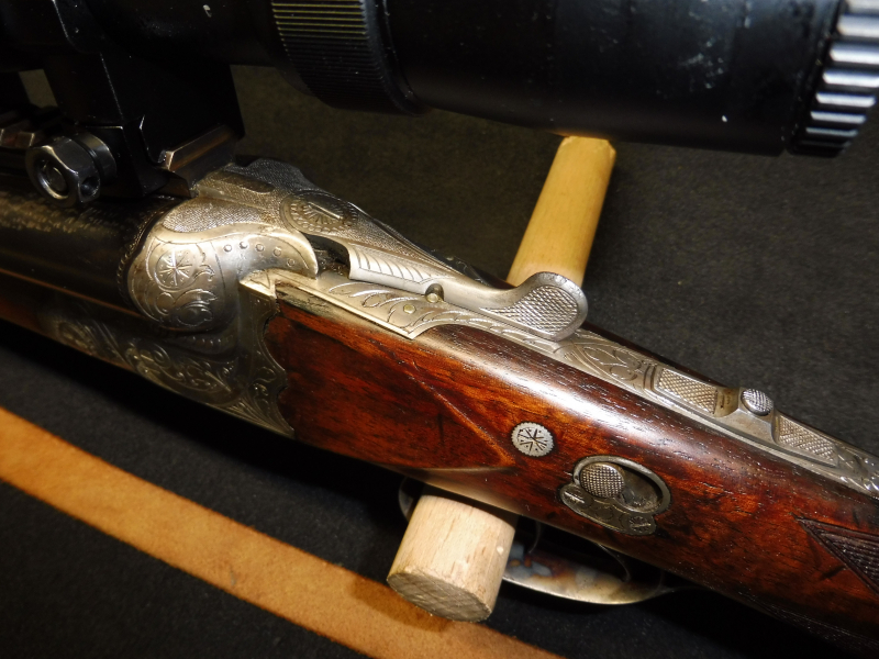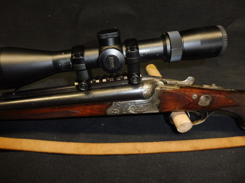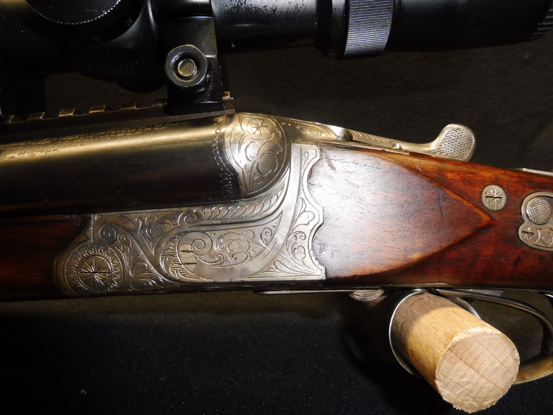 Angaben wie immer nach bestem Wissen und Gewissen!!!! Ich habe an den unmontierten Drilling an den vorhandenen Bohrungen eine Schiene montiert und ein Zielfernrohr der Marke NIKON MONARCH 2,5 10 x56 mit vierer Absehen montiert das Zielfernrohr hat am Rohrkörper Gebrauchsspuren ist jedoch ohne Mängel. Ein absolut gutes ZF. Nun zu dem Drilling leider haben die Schrottläufe äusserlich Spuren von denen ich nicht deuten kann woher sie kommen.Das Innenleben der Scchrottläufe und des Kugellaufs sind als wirklich neu zu bezeichnen sie blitzen wie am ersten Tag!!. Die Basküle schliesst wie neu und macht ein sattes Klack. Ich habe die Waffe auf hundert Meter eingeschossen wobei erst beim dritten Schuss eine leichte Wanderung nach oben festgestellt werden konnte. Nach dem Auskühlen der Büchse habe ich drei Schuss auf 4cm erzielen können.Der Schaft ist sehr ansprechend und hat keine grossen Macken siehe Fotos. Die Gravur besticht durch die scharf gestochenen Arabesken so ein Drilling im Försterkaliber 9,3x72R bekommt man zu diesem Preis sehr selten zu sehen ich verbürge mich um die Öulität des Drillings!!!