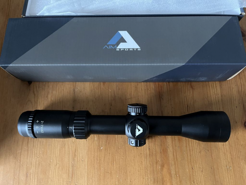 hier ein neues Zielfernrohr Aimsports 2-7x42, mit 30mm Durchmesser, schön kurz und leicht. Es ist ein Scout Scope, gut für den flüchtigen Schuss, mit weiterem Augenabstand. Die vom Hersteller angegebenen 21-27cm sind es nicht ganz, ich würde schätzen eher 15-20cm. War auf einer Scout Rifle vorgesehen die dann doch nicht verwirklicht wurde.