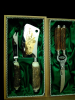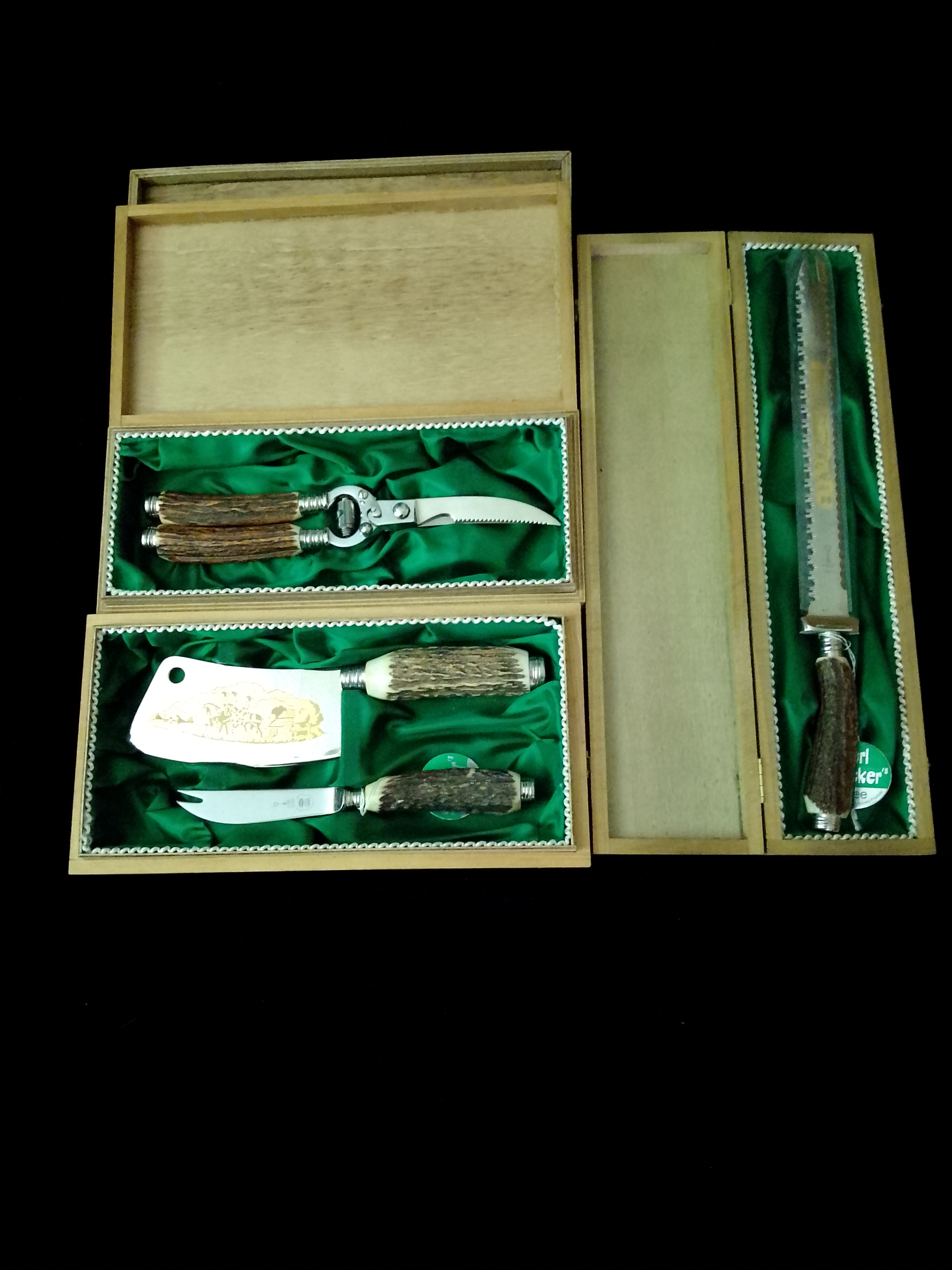Jagd oder Tranchierbesteck Original in Holzkisten, mit grüner Seide ausgeschlagen, Griffe aus echtem Hirschhorn mit Edelstahl Zwingen,