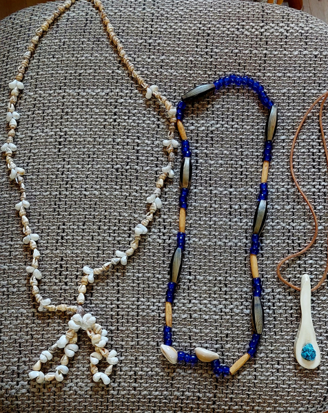 1 Kette aus Muscheln, blauen Perlen und wahrscheinlich Horn, sehr schön. Ohne Verschluss zum Umhängen, doppelt gelegt ca. 33 cm lang.