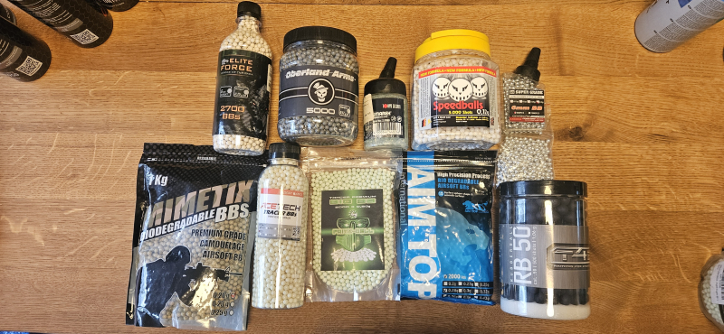 Zum Verkauf steht ein umfangreiches Airsoft BB Konvolut mit verschiedenen Marken, Gewichten und Mengen – ideal für Einsteiger oder Vielspieler.