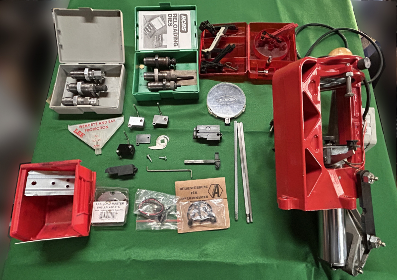 Zum Lieferumfang gehören die Zündhütchenzuführung für große und kleine Zündhütchen inkl. Setzstempel und Federn, zwei Zündhütchenbehälter (alte und neue Version), zweimal die Hülsenführung von PrecisionA (1x Ersatz) mit einigen Ersatzgummiringen, drei Führungsstangen für die Hülsenzuführung, Hülsenschieber für große und kleine Hülsen, ein Auffangbehälter für die fertigen Patronen inkl. Montageplatte, sowie einige gebrauchte Ersatzteile (siehe Bilder).