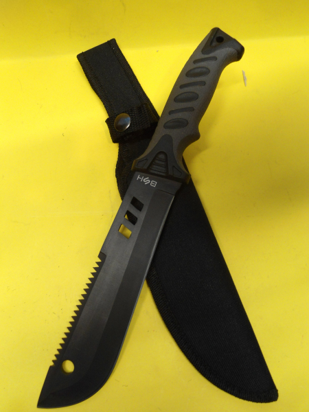 gut gearbeitetes Messer mit breiter Klinge und angedeuteter Sägezahnung oben