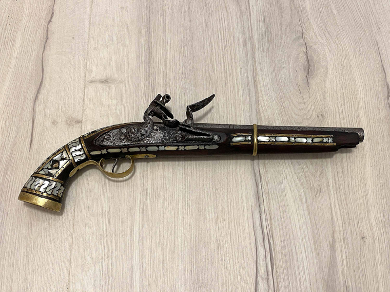 Verkaufe eine Steinschlosspistole (orientalisch oder afrikanisch?) mit reichlich Perlmutt-Intarsien und Messing- bzw. Kupferbeschlägen. Offensichtlich nur für Deko-Zwecke.