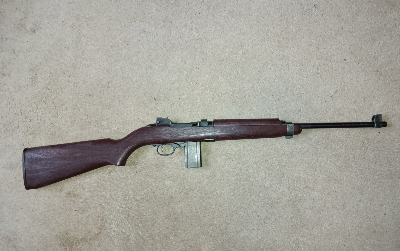 Sehr seltenes Gewehr zum Training des M1 Carbine.Bauzeit von 1968-1972.Maße und Gewicht entsprechend dem Original.Kunststoffschaft in Holzoptik.Funktion :man lädt 20 Rundkugel in eine Öffnung des Vorderschaft,die sich durch den Durchladehebel verschließen lässt.Gespannt wird über das zurückschieben des Laufs in das System und anschließend nach vorn ziehen(System Quackenbusch).Das entnehmbare Magazin dient als Kugelreservoir.Das Gewehr hat eine dem Vorbild entsprechende Visiereinrichtung und ist funktionsfähig.Privatverkauf,keine Garantie,Nachverhandlung, Rücknahme, Sachmängelnhaftung oder anderes.Mit der Abgabe eines Gebotes erklären Sie sich damit einverstanden.