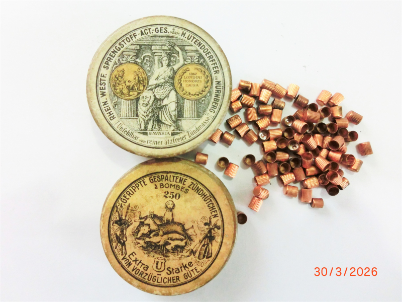 Biete hier eine schöne alte Pappdose Zündhütchen 4,5mm gerippt Extra Starke von vorzüglicher Güte ca.100Stück in sehr gutem Zustand RWS -Act.-Ges.vormals Utendoerffer Nürnberg zum Kauf an Sammler oder Schützen. Verkauf nur in Deutschland !!!!! Kein Verkauf ins Ausland !!!!!