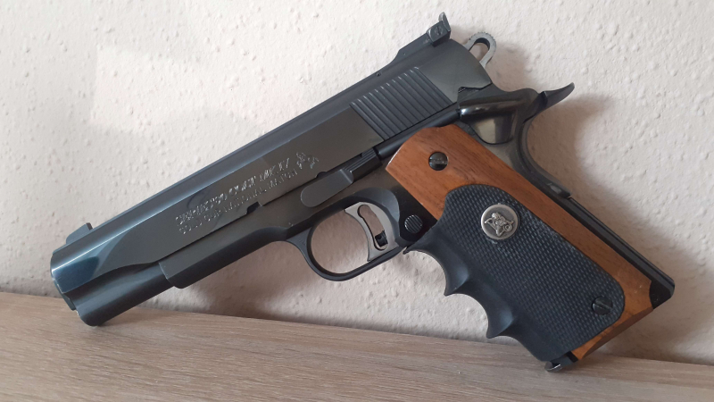 Sie bieten auf eine Colt Gold Cup im Kaliber .45 ACP aus der Serie 80. Der staatliche Beschuss wurde 1993 (KD) durchgeführt. Die für die 80er Serie typischen Teile im Verschlusssystem wurden bereits von einem früheren Besitzer ausgebaut. Die Griffschalen, ich glaube die nennen sich American Legend, waren bereits beim Kauf der Pistole vorhanden. Ich habe die Waffe selten geschossen weil sie in meiner roten WBK eingetragen ist. Zum sportlichen schießen benutze ich eine andere Waffe. Die Pistole wird selbstverständlich nur an einen Erwerbsberechtigten verkauft. Bei einer Selbstabholung entfallen die Portokosten.