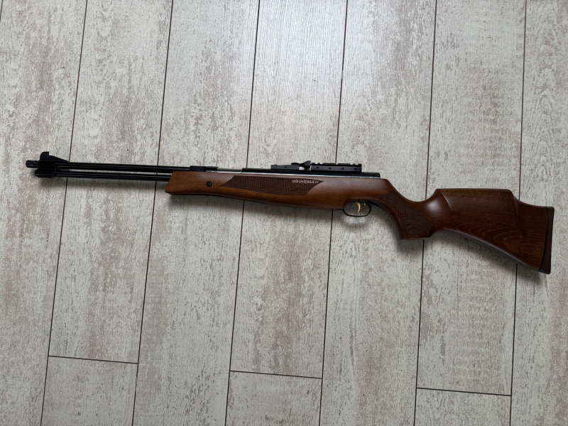 Weihrauch HW77 K 4,5 gekauft bei Waffen-Schlottmann ( Beschreibung siehe unten im link ) das Gewehr ist im Neuzustand und es wurden keine 100 Schuss durchgeführt. Mit Laufgewinde, Schalldämpfer und Optikschiene.