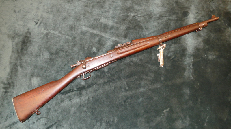 Springfield 1903, Hersteller: Rock Island Arsenal, Kal. .30-06 Spring. Erhaltungszustand altersgemäß sehr gut, Lauf matt (keine Rostnarben), Lauflänge 60cm, Gesamtlänge 110cm, die Waffe wurde mal "demilitarisiert", sprich der Bajonetthalter wurde abgefräst und die Schiebevisierung wurde auf 300m blockiert (wurde entfernt, Spuren sichtbar, aber ein zweites, unverbasteltes Kimmenblatt ist in dem Tütchen, das am Riemenbügel hängt.