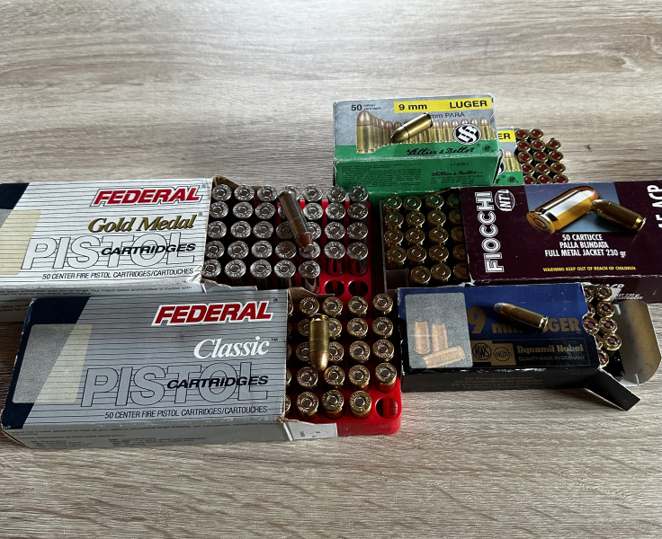 Habe den Schießsport aufgegeben und biete den Rest meiner Munition zum Kauf an. Es sind insgesamt 300 Schuss bzw. 299! Eine Patrone der Federal Gold Medal fehlt. 49 Patronen 250 g. 44 REM. Magnum, 50 Patronen 230 g. 45 A Full Metal Jacket, 50 Patronen 230 g. 45 ACP Full Metal Jacket, 50 Patronen 8,0 g. 9 mm Luger Teilmantel-Geschoss, und 100 Patronen 8,0 g. 9 mm Luger Para.