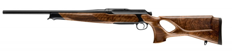 Ein Schmuckstück erster Güte: Veredelt durch DLC (Diamond like Carbon) beschichtete Oberflächen von Lauf und Gehäuse sowie einer Kammer mit Sonnenschliff. Die Kammergriffkugel ist gerändelt und mit der Sauer Schraube gekrönt. Eine luxuriöse Ausstattung, die nicht nur in Verbindung mit einem Holzschaft, sondern auch mit einem Carbon- oder Polymerschaft, voll zur Geltung kommt.