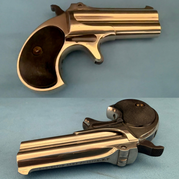Sie bieten hier auf einen seltenen Remington Deringer Kaliber .41 Randfeuer. Der bildhübsche Deringer befindet sich in einem ausgezeichneten Zustand, alle Oberflächen sind top. Die Vernickelung ist klasse, die Griffschalen wie neu, die Läufe blank. Natürlich intaktes Gelenk, Ausstoßer funktioniert, kurzum: Museumsqualität! Die Pistole hat keine Fremdstempel, deshalb nur an Sammler, Händler oder Export.