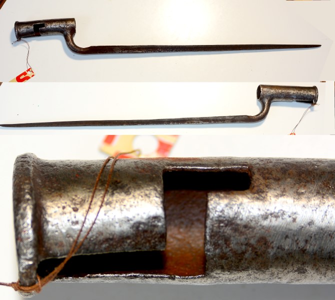Tüllenbajonett mit 43cm langer Dreikantklinge, Gesamtlänge 53 cm, Innendurchmesser der Tülle 23 mm, Schlitzbreite 7mm, Kornlänge 8 mm, alte Rostpatina, noch ohne Feststellring