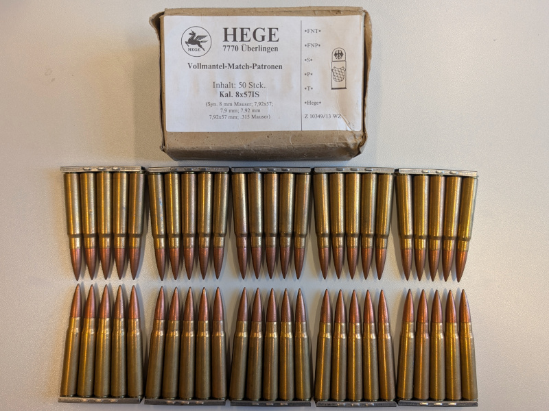 Versteigere hier eine 1 Schachtel á 50 Schuss 8 x 57 IS Vollmantel-Match-Patronen HEGE auf Ladestreifen.