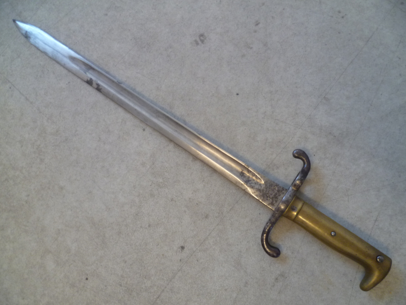 Bajonett wie abgebildet, Messinggefäß in guter Erhaltung, Klinge mit Oxidation, Drücker funktioniert.