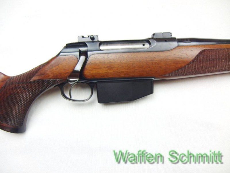 Sie bieten auf einen Stutzen (Repetierbüchse) Sauer Mod.202 im Kaliber 7x64 montiert mit EAW Schwenkmontagebasen. Verschlußkasten aus Stahl. 51cm Lauflänge mit verstellbarer Visierung, Druckknopfsicherung auf dem Pistolengriff, einstellbarer Direktabzug mit Rückstecher, herausnehmbares 5-Schuß Magazin, Nußbaumholzschaft mit bayerischer Backe mit Doppelfalz und 2cm Gummischaftkappe, abnehmbare Riemenbügel, Schaftlänge 37,5cm, Gesamtlänge 104cm. Gebrauchsspuren auf Schaft und Metallteilen, ansonsten guter Zustand!!!