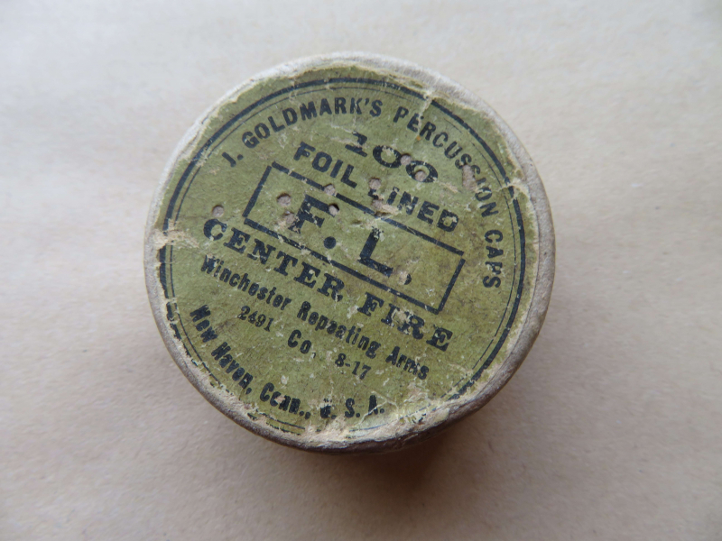 Antike Goldmarks Percussions Zündhütchen Dose aus Pappe. Die Dose hat einen Durchmesser von 4 cm und sie ist 1,5 cm hoch. Das seitliche Label ist vorhanden. Aufschrift siehe Foto. Natürlich hat die alte Dose Gebrauchsspuren. Auf das Bild darf verwiesen werden. -keine Gewährleistung und keine Rücknahme-