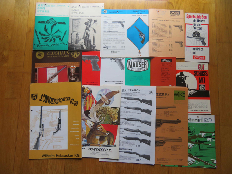 Angeboten wird ein Konvolut an Waffenprospekten und Broschüren sowie einer Vielzahl von Einzelblättern (Preislisten) insgesamt 73 Stück aus den 60iger und 70iger Jahren, darunter 3 Preislisten der Firma Collector Guns und 2 Kataloge der Firma Günter Schmitt. Die Exemplare sind u.a. von der Firma Walther, Diana, Krico, Browning, Smith & Wesson, Hämmerli, Anschütz, Hege, Hebsacker, Paul Jacobi, Mauser, Winchester usw. Auf dem eingestellten Foto ist nur ein Teil des Konvoluts zusehen. -keine Gewährleistung und keine Rücknahme-
