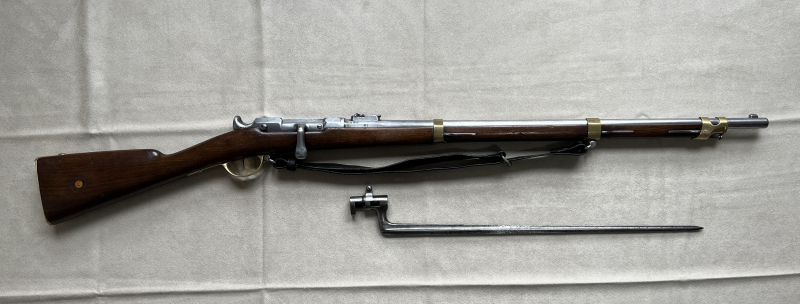 Ich verkaufe mein Chassepot Mle 1866 der Kavallerie von 1870. Das Gewehr ist nummerngleich, bis auf den Putzstab und das Bajonett. Alles funktioniert einwandfrei, die Nadel ist intakt und die Züge des Laufes sehen dem Alter entsprechend noch sehr gut aus. Das Verschlussstück wurde kürzlich gereinigt und neu gefettet. Der Lederriemen wurde mit Lederfett behandelt und scheint schon recht alt zu sein, jedoch weiß ich nicht ob er original ist.