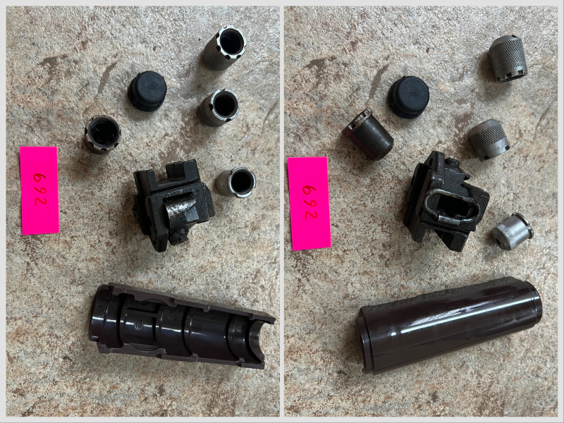 Ersatzteile für AK47 / AK74 aus DDR Suhl Produktion. Gebrauchter Zustand mit Lagerspuren, siehe Foto. Durch Reinigung lässt sich der Zustand deutlich verbessern. Sie bieten hier genau auf die abgebildeten Stücke. Freie Ersatzteile, wird immer seltener angeboten. Mit dabei auch der originale Gummi Mündungschutz.