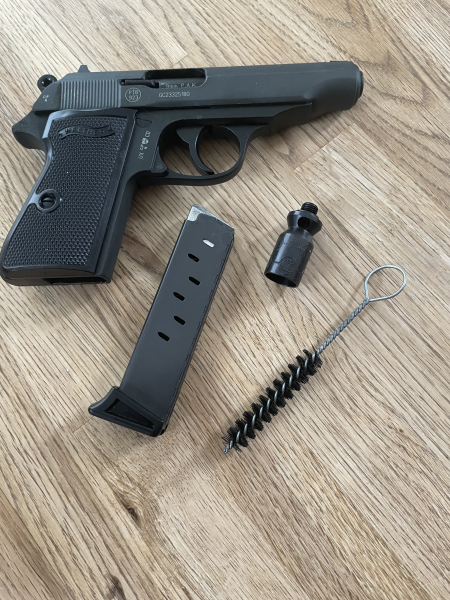 Walther PP 9mm Schreckschusspistole im Bestzustand. Es wurden max 10 Schuss abgegeben, sonst in der Vitrine - absolutes Sammlerstück. Lieferumfang wie bei Neukauf. Pistole, Magazin, Signalbecher, Reinigungsbürste und Original Waffenkoffer. Zusätzlich lege ich Munition 9 mm bei. (5 x Knall - 3 x Pfeffer).