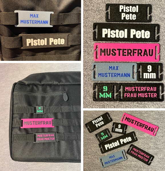 Ich verkaufe hier selbst hergestellte Namensschilder für Taschen mit dem sogenannten Mollesystem. Sie werden im 3D Druckverfahren aus PLA hergestellt und haben eine Dicke von 3mm.