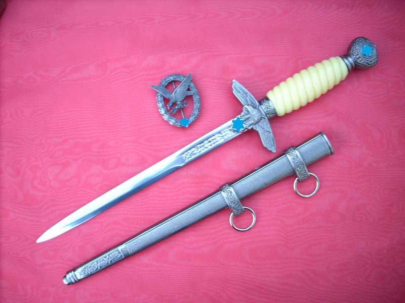 Sehr schönes Set: Luftwaffendolch LOD für Offiziere der Luftwaffe mit Verzierungen auf der Klinge. Dabei ein Fliegerschützenabzeichen mit Blitzbündeln. Äußerst geringe Gebrauchsspuren. Kein Herstellerlogo. Sehr guter Zustand siehe Fotos, die, wie immer, Bestandteil der Artikelbeschreibung sind. Keine Garantie und keine Rücknahme.