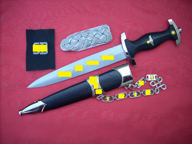 Sehr schöner SS-Kettendolch mit bezogener Scheide. Dabei eine gewebte SD-Ärmelraute (Sicherheitsdienst) + 1 Schulterklappe. Geringe Gebrauchsspuren. Mit RZM-Herstellercode RZM M7/14 (steht für P.D. Lüneschloß, Solingen). Das Motto auf der Vorderseite schön tief geätzt. Pastille und Adler sauber eingelegt.. Gesamtzustand siehe die Fotos, die, wie immer, Bestandteil der Artikelbeschreibung sind. Keine Garantie und keine Rücknahme.