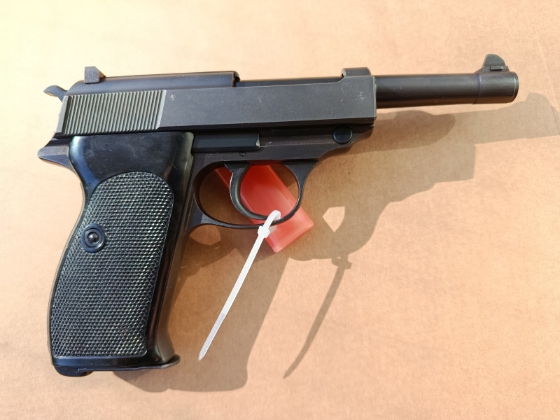 Ein ganz besonderes Stück: P38 in einem beinahe neuwertigen Zustand befindliche Kombination aus einem Stahlgriffstück aus Walther Zella Mehlis Fertigung mit WaA Stempel 359, das Oberteil aus später Ulmer Fertigung mit verstärkten Schlitten. Waffe ohne Spiel, Lauf TOP, Waffe insgesamt nur minimal gebraucht.