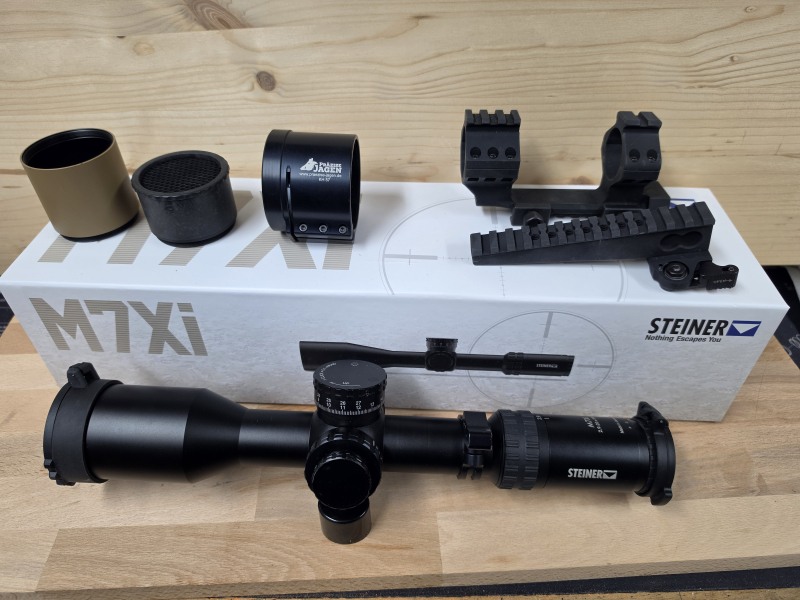 Verkaufe gebrauchtes Steiner M7Xi 2,9-20×50 mit beleuchtetem Tremor 3 Absehen in Bestzustand.Minimale Gebrauchsspuren an den seitlichen Türmen,sonst alles top.Mit dabei eine Montage von LaRue Tactical mit abnehmbaren Diveboard u. eingebauter Verkantungslibelle (leuchtet im Dunkeln), Verkantungslibelle von Accuracy 1st, Sonnenblende, Wabenfilter von Tenebraex, Präzise Jagen Adapter, Steiner Scopecaps und Originalverpackung.