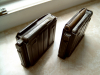 Die Magazine sind im ordentlichen Zustand, sauber und funktionieren "trocken" einwandfrei. Im Schuß mangels Gewehr nicht getestet. Der Lack ist teilweise abgenutzt. Das ohne Patrone sieht mir aus wie brüniert / ohne Lack. Die Jute Reprotasche ist dabei.