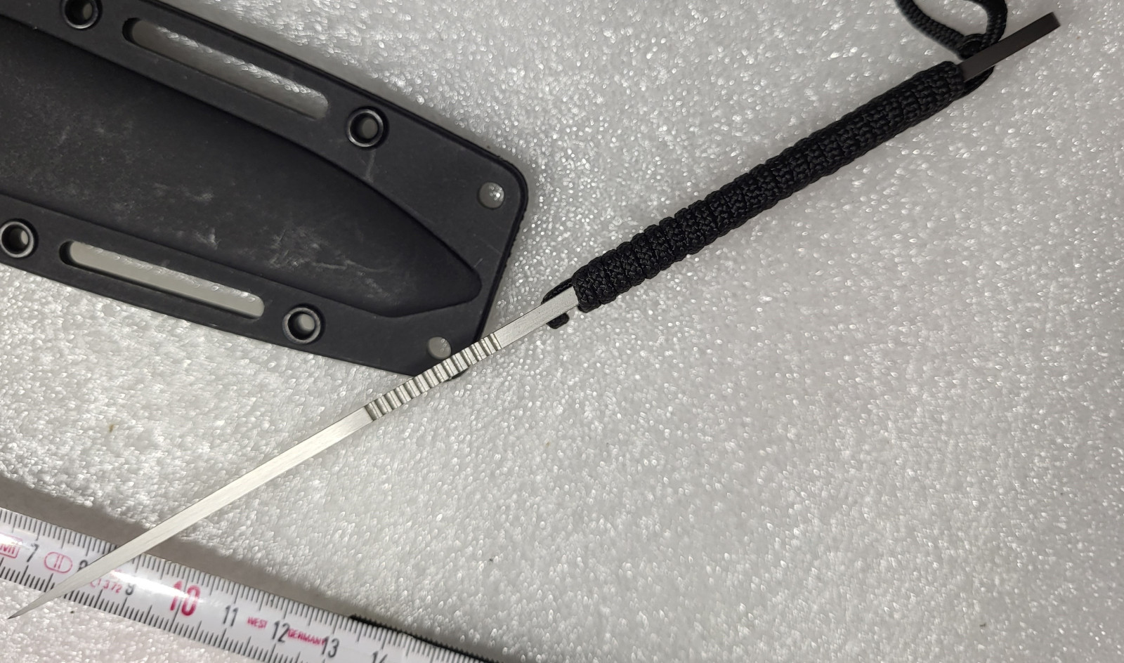 Dies ist ein feststehendes Messer, das in den 1990ern in Taiwan hergestellt wurde. Es verfügt über eine robuste 3,5" lange Klinge und hat eine Gesamtlänge von 8,25".