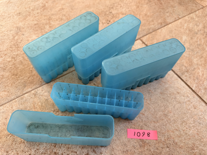 Sie bieten hier auf die Reste eines Wiederladers. 4 Patronenboxen Rifle von J&J für Gewehrpatronen bis max. 30-06. Es handelt sich hier um gebrauchtes Zubehör, siehe Foto. Sie bieten auf das ganze Konvolut auf dem Foto.